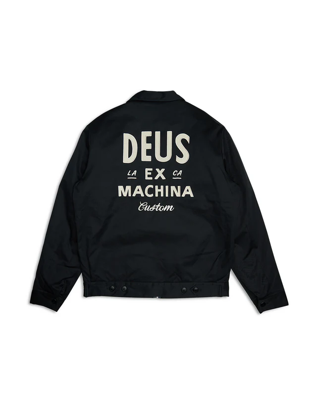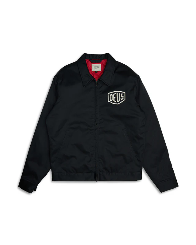 Regular fit classic work wear jacket with twill applique art at the chest and back, jet pockets, zip front closure, snap button hem adjuster, cotton and polyester mix fabrication with a recycled nylon lining, and a heavy garment wash.
